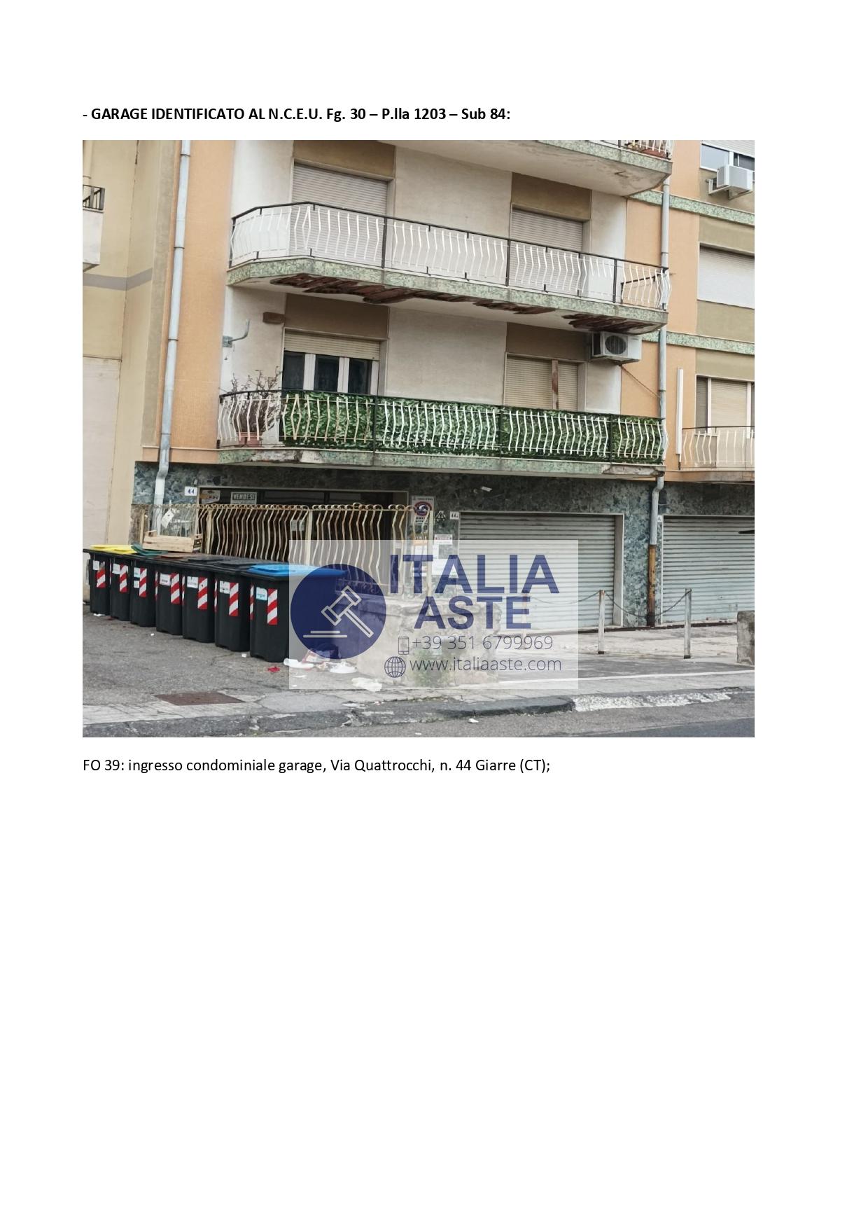 Diritto di piena proprietà su garage posto al P.S 1 sito in Giarre, Via Quattrocchi n.42, censito al NCEU di detto Comune, al foglio 30, part. 1203, sub. 84, categoria C/6, mq 18.PERCHÉ SCEGLIERE NOI?